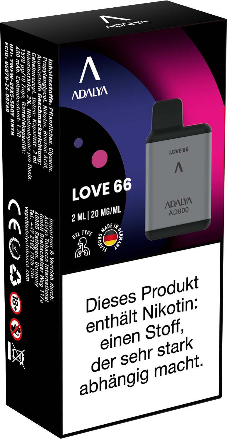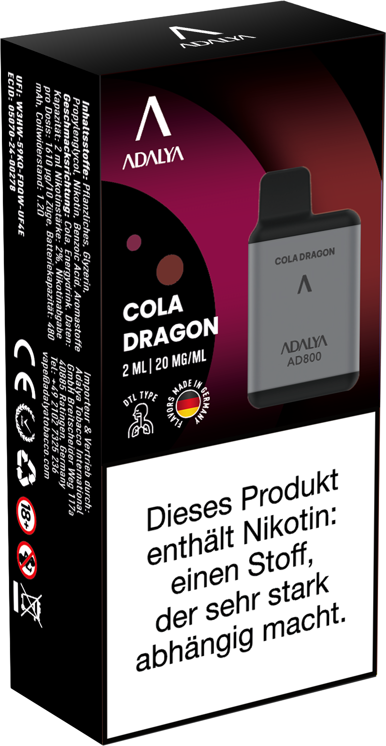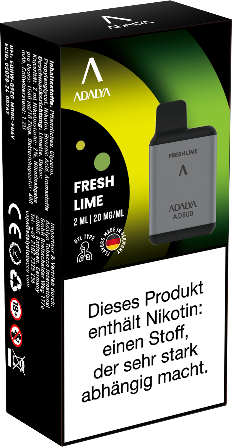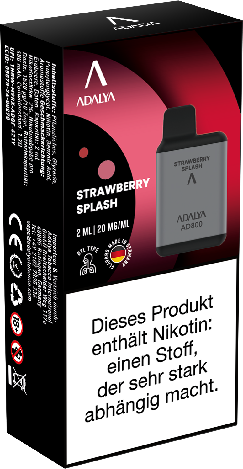 Adalya AD800 ist DIE leistungsstarke Einweg Vape mit über 20 Sorten aus der beliebten Adalya Geschmacksreihe. Aromen made in Germany bringen Qualität und unwiderstehlichen Geschmack zusammen in ein Gerät.